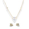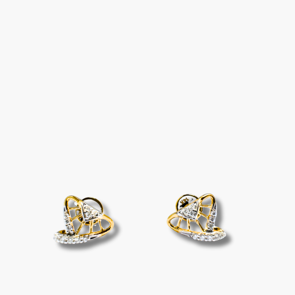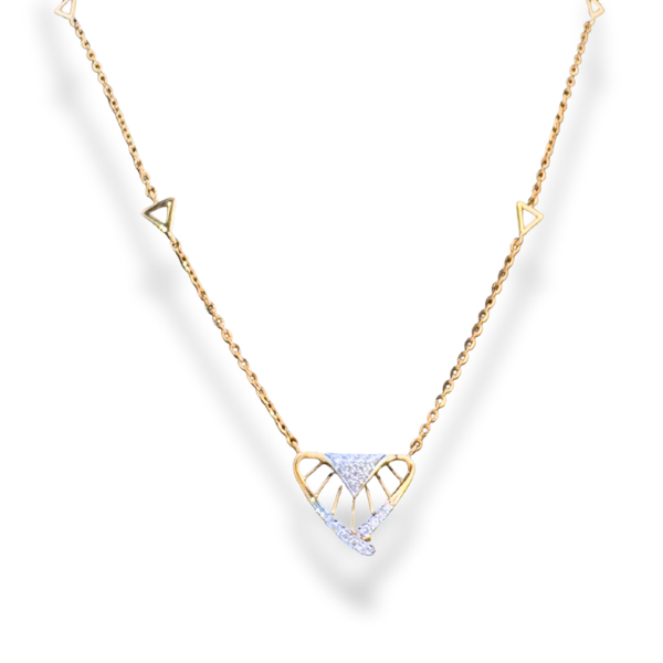 This striking 14k yellow gold set offers a touch of modern artistry. The stud earrings feature a uniquely sculpted, flowing geometric design delicately pavé-set with shimmering diamonds and secure screw-back posts. The matching necklace showcases a winged pendant, also beautifully pavé-set with diamonds and suspended from a fine chain.