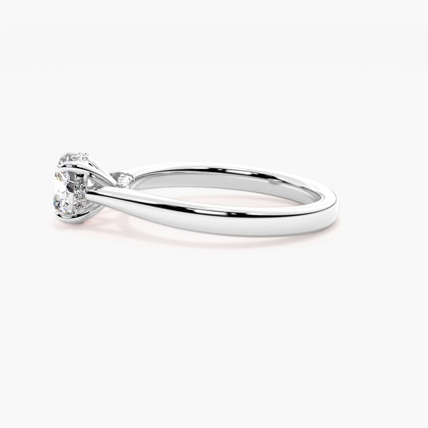A captivating blend of classic and contemporary, this Solitaire ring features a stunning center stone, elegantly held by a secure four-prong setting. A subtle surprise awaits: a hidden halo of delicate diamonds, adding a touch of sparkle and sophistication. This exquisite ring is a testament to timeless elegance.
