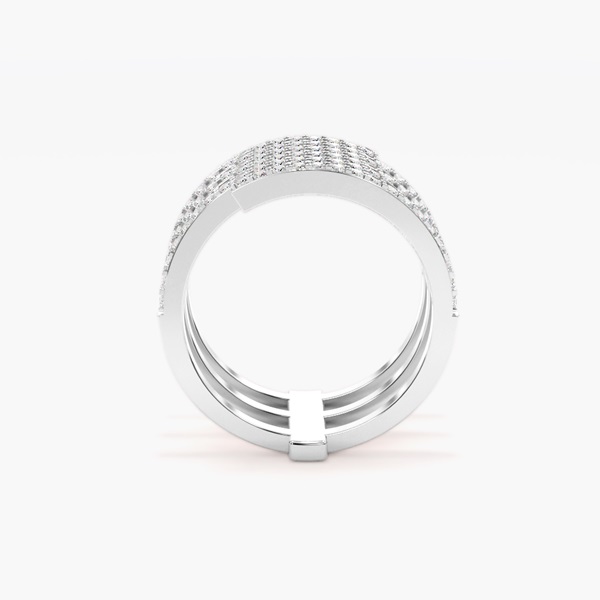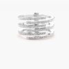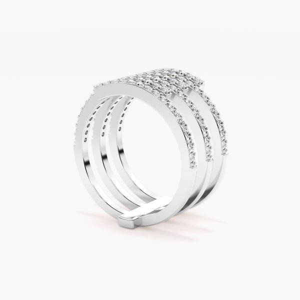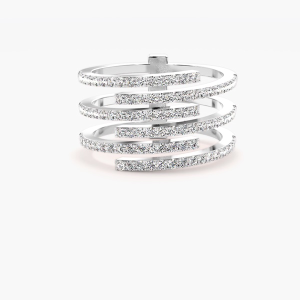 This striking multi-band diamond ring is a bold expression of modern luxury and sophistication. Featuring five gracefully curved rows, each adorned with brilliant pavé-set diamonds, it creates a dazzling spiral effect that radiates light and sparkle from every angle. The contemporary open design adds depth and dimension, making this statement diamond ring a perfect balance of elegance and edge. Handcrafted with precision in your choice of precious metal, it is ideal as a cocktail ring, anniversary gift, or fashionable everyday piece. A true luxury diamond ring, this captivating design embodies individuality, style, and timeless glamour.