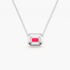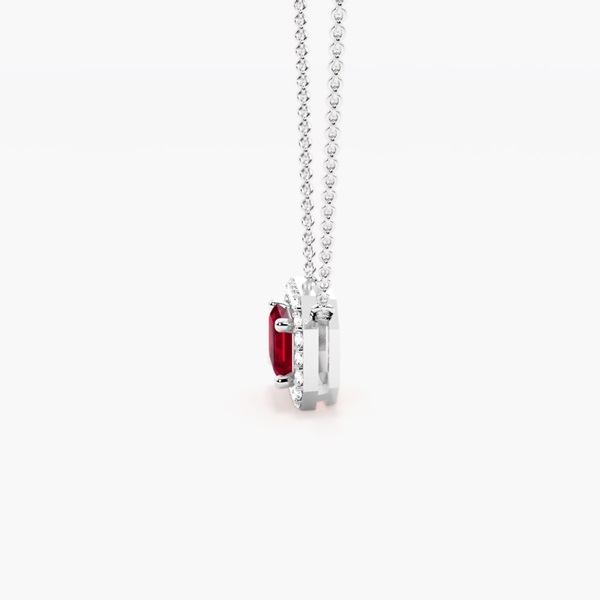 This elegant necklace features a stunning rubies, a symbol of wisdom, loyalty, and truth. Surrounded by a sparkling halo of diamonds, the rubies deep red hue is intensified, creating a truly mesmerizing piece of jewellery. The necklace evokes a sense of tranquility and elegance, making it a perfect choice for any occasion.