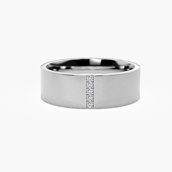 This bold and sophisticated men’s wedding band is a testament to contemporary luxury. Its wide, sleek silhouette is expertly crafted from luminous gold or platinum, boasting a flawlessly polished finish. A singular, elegant line of brilliant diamonds is meticulously set within a vertical channel, creating a striking focal point that contrasts beautifully with the ring’s minimalist design. This piece is more than a band; it’s a confident and modern statement. It is the perfect choice for the discerning gentleman who seeks a blend of masculine strength and refined luxury jewellery, symbolizing a truly unique and powerful commitment.