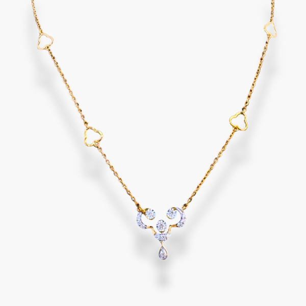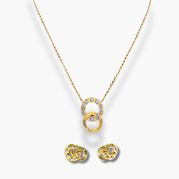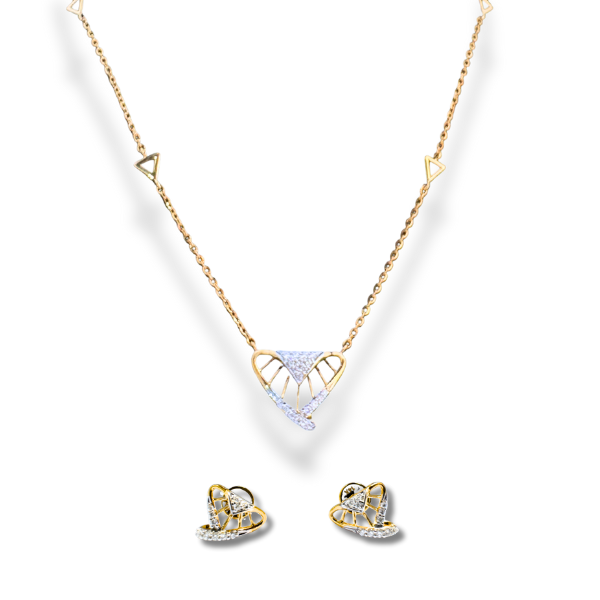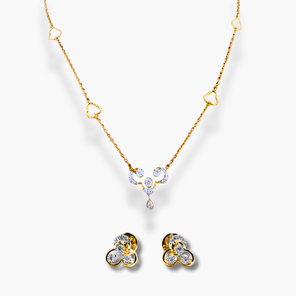 Indulge in delicate sparkle with this charming 14k yellow gold earring and necklace set. The rounded stud earrings subtly shimmer with diamonds, complementing the necklace’s dainty, diamond-kissed heart pendant and the heart details adorning its chain.